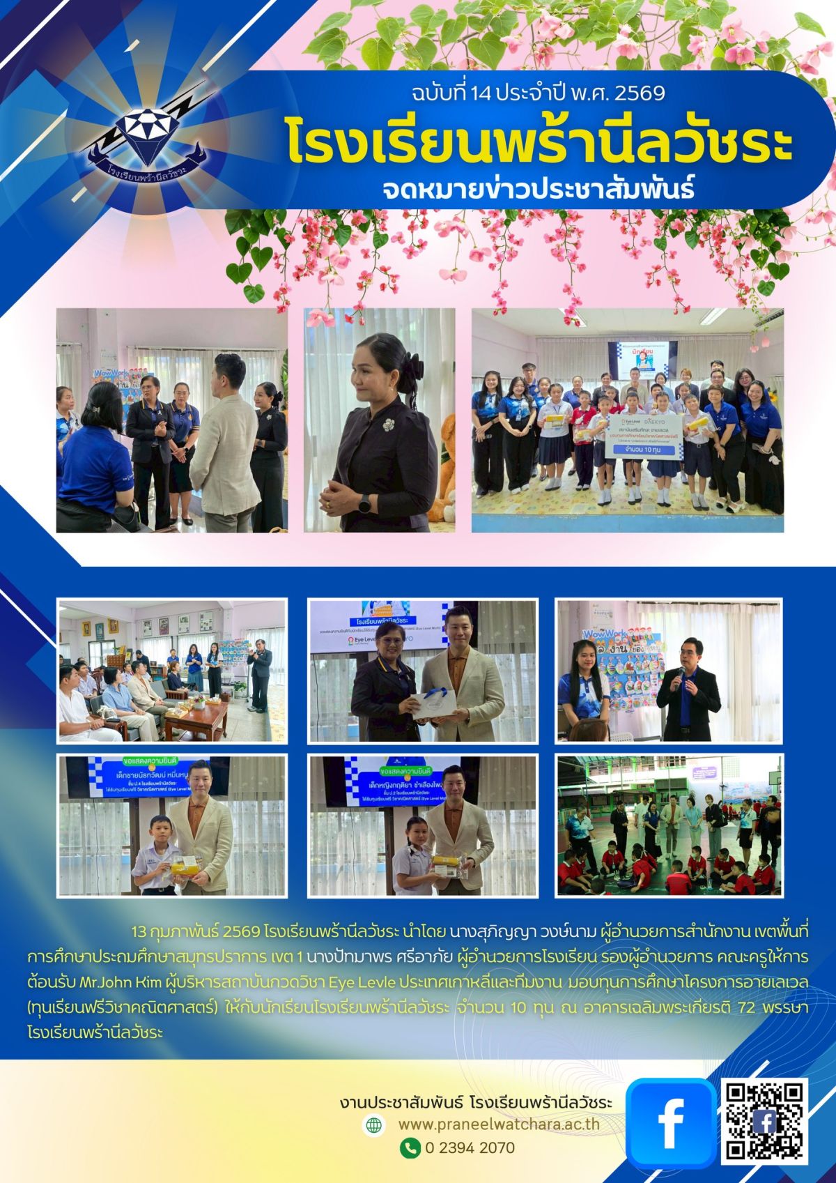 13 กุมภาพันธ์ 2569 โรงเรียนพร้านีลวัชระ นำโดย นางสุภิญญา วงษ์นาม ผู้อำนวยการสำนักงาน เขตพื้นที่การศึกษาประถมศึกษาสมุทรปราการ เขต 1 นางปัทมาพร ศรีอาภัย ผู้อำนวยการโรงเรียน รองผู้อำนวยการ คณะครูให้การต้อนรับ Mr.John Kim ผู้บริหารสถาบันกวดวิชา Eye Levle ประเทศเกาหลีและทีมงาน มอบทุนการศึกษาโครงการอายเลเวล (ทุนเรียนฟรีวิชาคณิตศาสตร์) ให้กับนักเรียนโรงเรียนพร้านีลวัชระ จำนวน 10 ทุน ณ อาคารเฉลิมพระเกียรติ 72 พรรษา โรงเรียนพร้านีลวัชระ