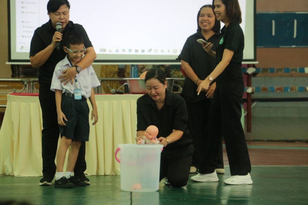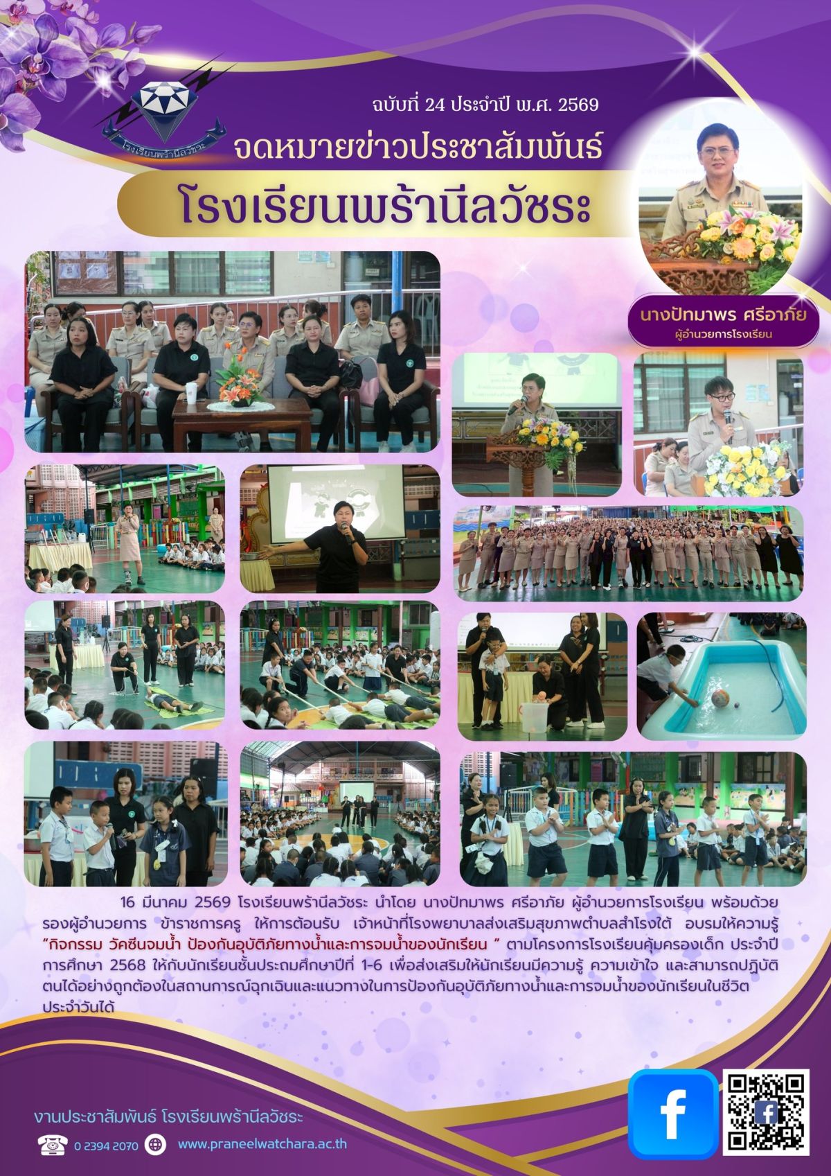 16 มีนาคม 2569 โรงเรียนพร้านีลวัชระ นำโดย นางปัทมาพร ศรีอาภัย ผู้อำนวยการโรงเรียน พร้อมด้วย รองผู้อำนวยการ ข้าราชการครู ให้การต้อนรับ เจ้าหน้าที่โรงพยาบาลส่งเสริมสุขภาพตําบลสำโรงใต้ อบรมให้ความรู้ “กิจกรรม วัคซีนจมน้ำ ป้องกันอุบัติภัยทางน้ำและการจมน้ำของนักเรียน ” ตามโครงการโรงเรียนคุ้มครองเด็ก ประจำปีการศึกษา 2568 ให้กับนักเรียนชั้นประถมศึกษาปีที่ 1-6 เพื่อส่งเสริมให้นักเรียนมีความรู้ ความเข้าใจ และสามารถปฏิบัติตนได้อย่างถูกต้องในสถานการณ์ฉุกเฉินและแนวทางในการป้องกันอุบัติภัยทางน้ำและการจมน้ำของนักเรียนในชีวิตประจำวันได้
